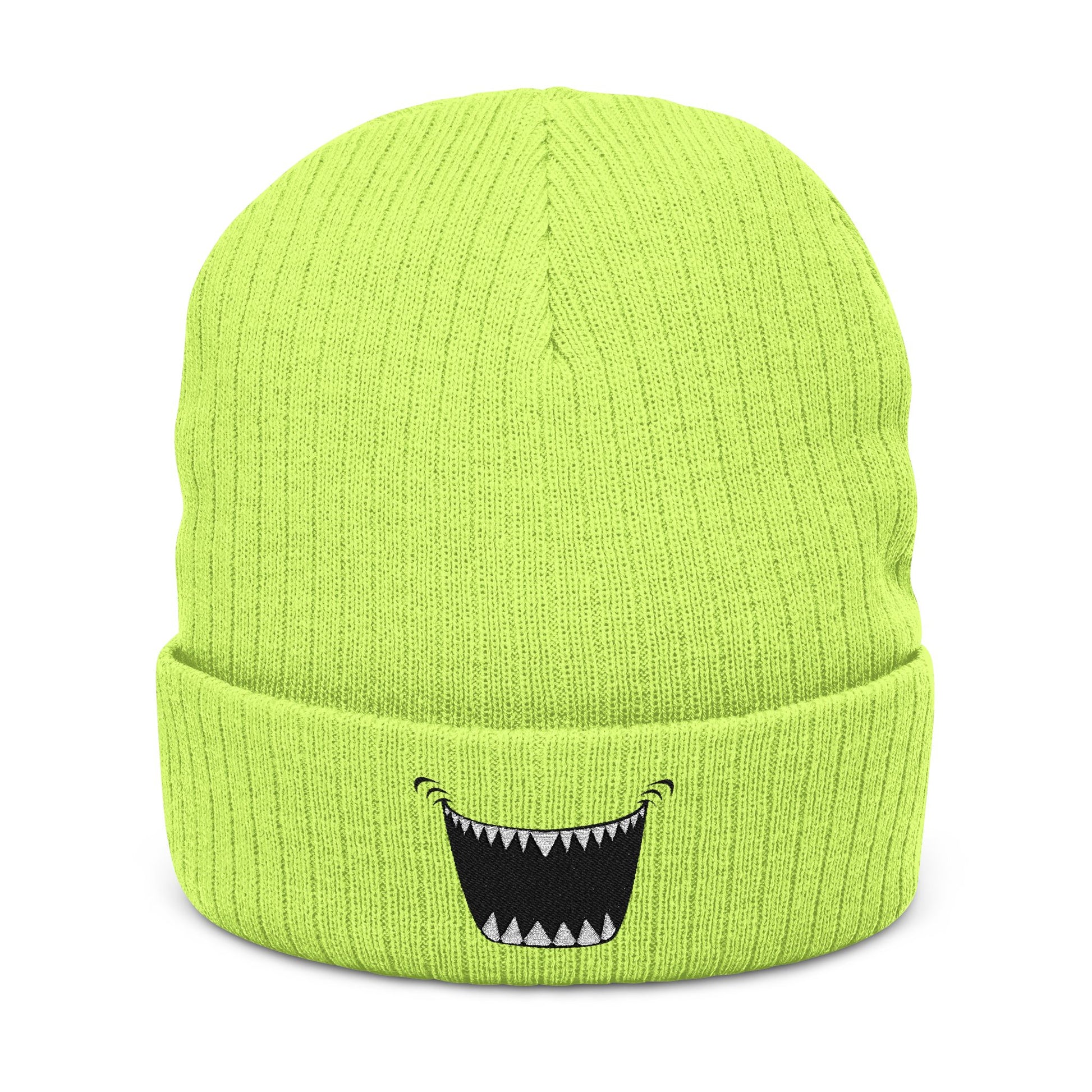 Embroidered Monster Smile Ribbed Beanie — Knit Cuffed Winter Hat