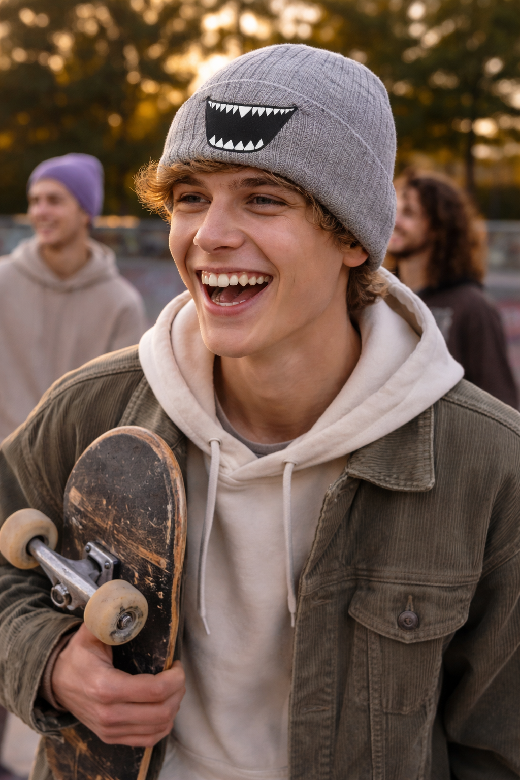 Warm, textured, and a little bit playful — this ribbed knit beanie brings cozy utility with a touch of attitude. The double-layer cuff holds heat close while the soft ribbed fabric molds to your head. The small embroidered mouth adds character without shouting, so it slips into everyday wear: commuting, late-night walks, and campfire hangs. Wear it pulled low over your ears when the wind bites, or cuffed higher for a cleaner silhouette. It lives in backpacks, on coffee runs, and beside your favorite jacket — a quiet statement that keeps you comfortable and a little mischievous.