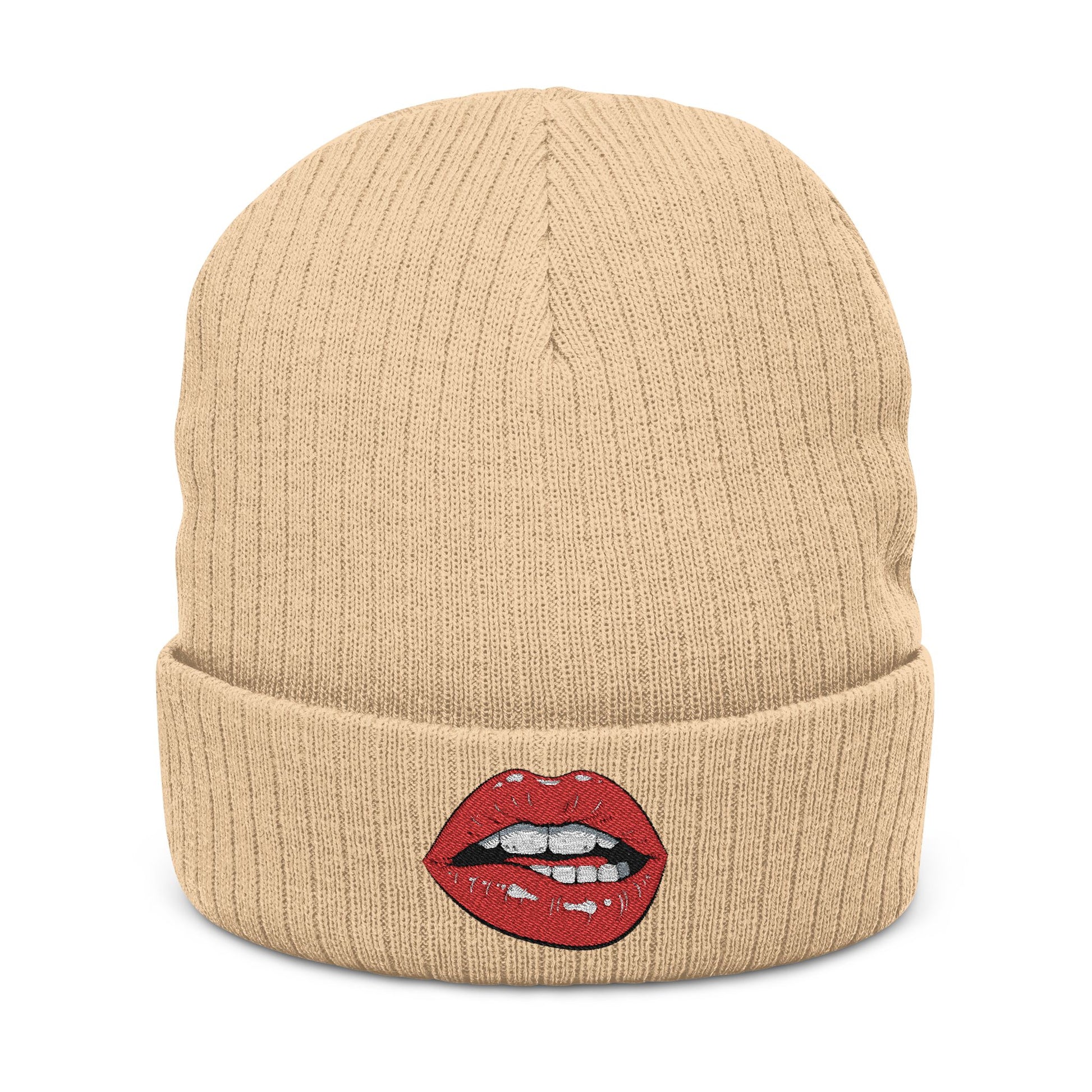 Embroidered Red Lip Ribbed Beanie Trendy Knit Hat for Women