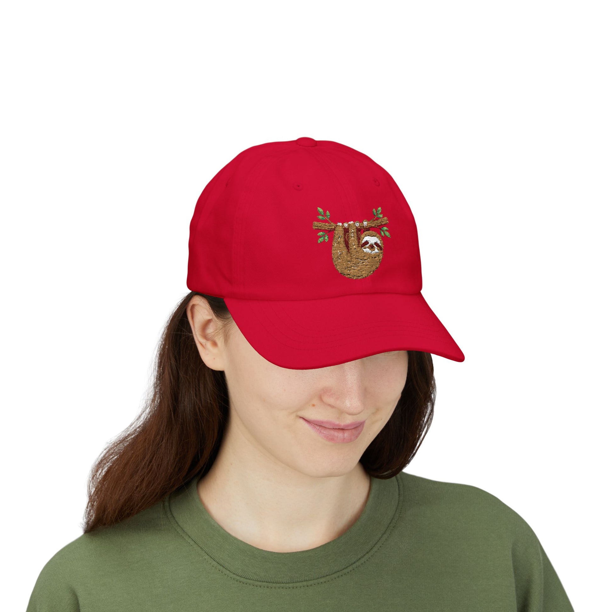 Soft, sun-worn cotton and a sleepy sloth stitch — this dad cap brings a slow, smile-filled energy to everyday wear. Lightweight and unstructured, it settles low on the head and lets the embroidered sloth hanging from a leafy branch do the talking. Wear it on long walks, lazy weekend mornings, or when you want a laid-back accent that says ‘I move at my own pace.’ The muted tones of the design pair easily with tees, denim, or an oversized sweater, and the antique-brass hideaway strap keeps the silhouette clean while letting you dial in the fit. Small details — precurved visor, sewn-in label, brand sticker — give it a crafted feel without fuss. For those who prefer comfort over rush, this cap feels like a quiet, contented exhale.